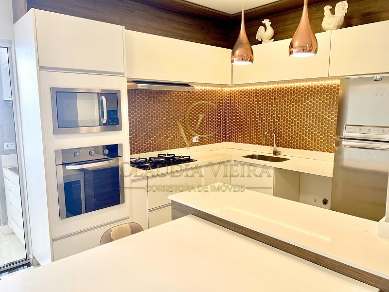 Forno embutido a gás, cooktop a gás, cooktop elétrico, micro-ondas embutido, geladeira e dois depuradores.