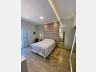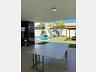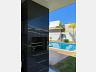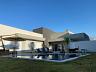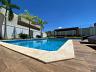 Área de lazer e espaço gourmet, com churrasqueira, pia, banheiro e piscina.