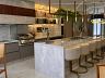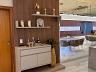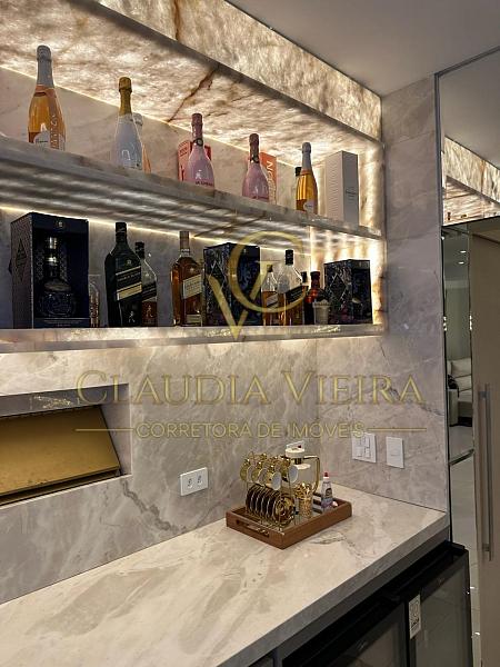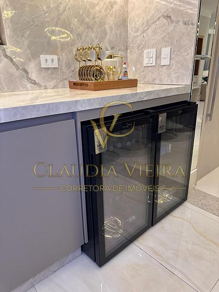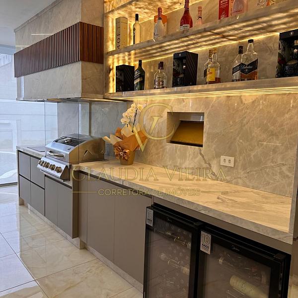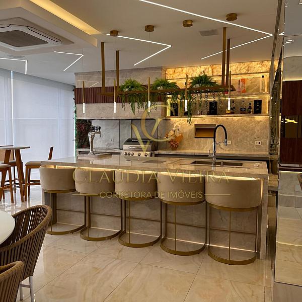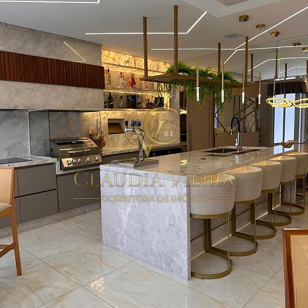 A cozinha e o gourmet é completa e equipada, com acabamentos sofisticados em pedras Ônix e Mármore Paraná, além de marcenaria e eletrodomésticos.