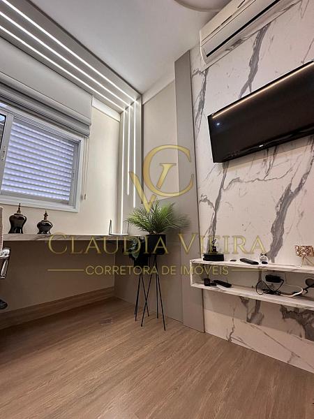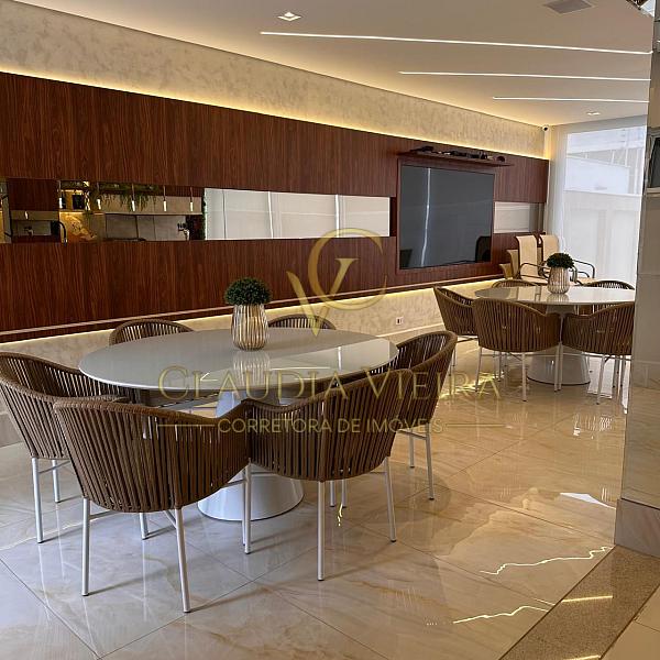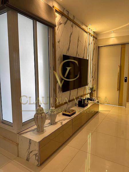 A área social conta com living elegante e espaço de TV com telão de 80”, integrado à cozinha e ao espaço gourmet.