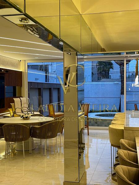 Na área externa, o imóvel conta com piscina com aquecimento solar, mobiliário para área da piscina e iluminação em LED, criando um ambiente sofisticado e acolhedor.