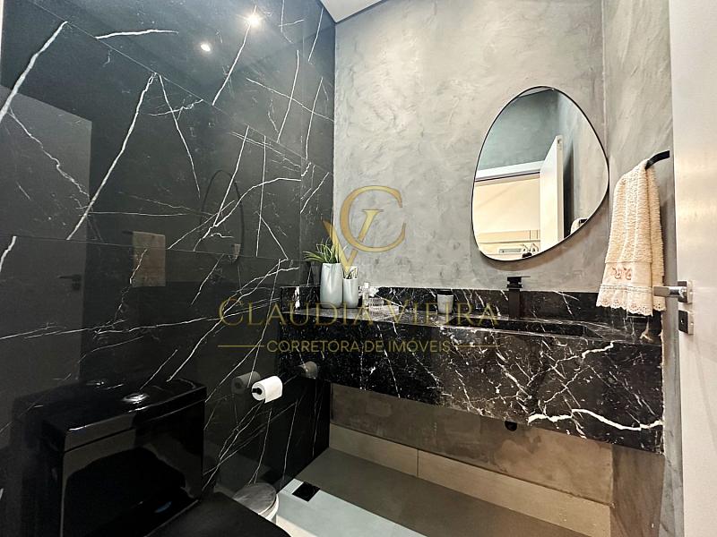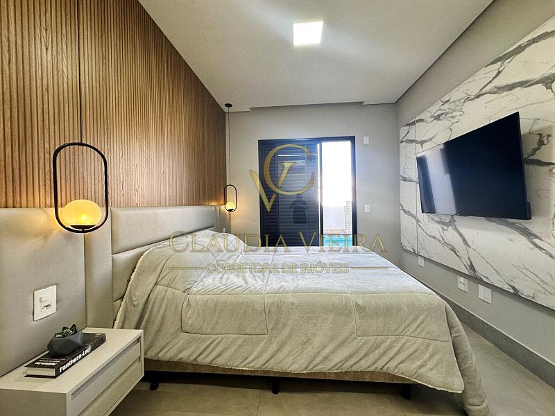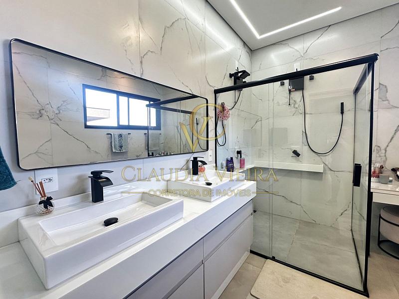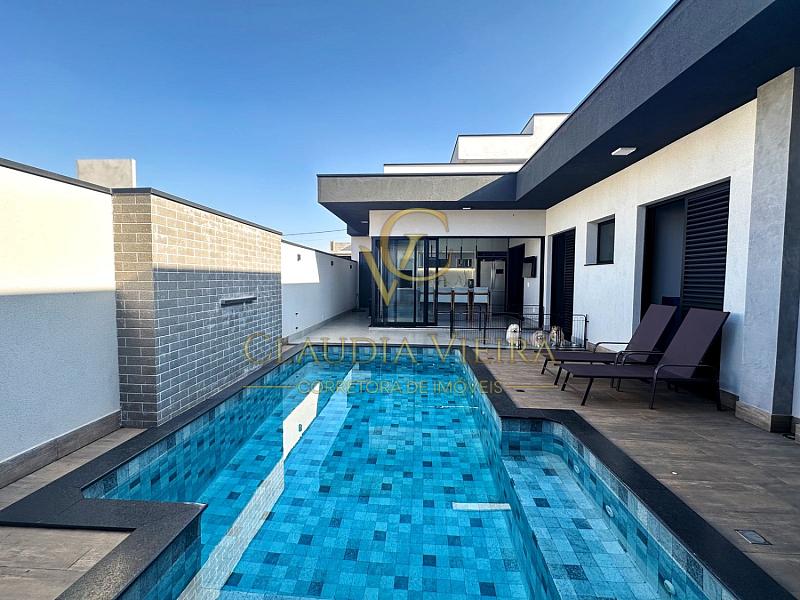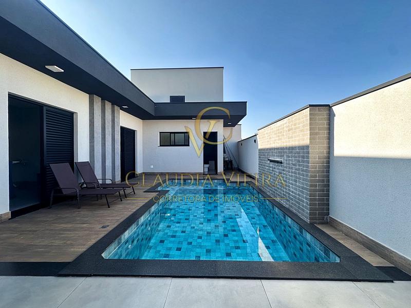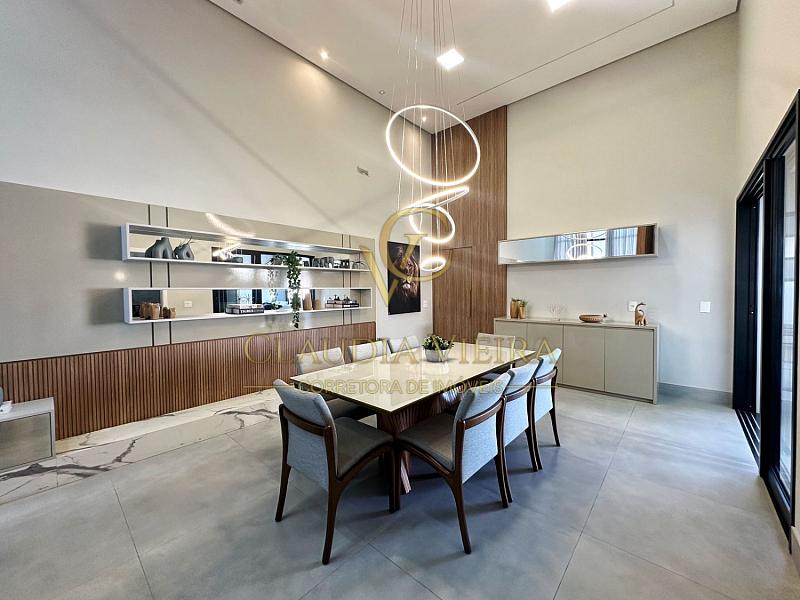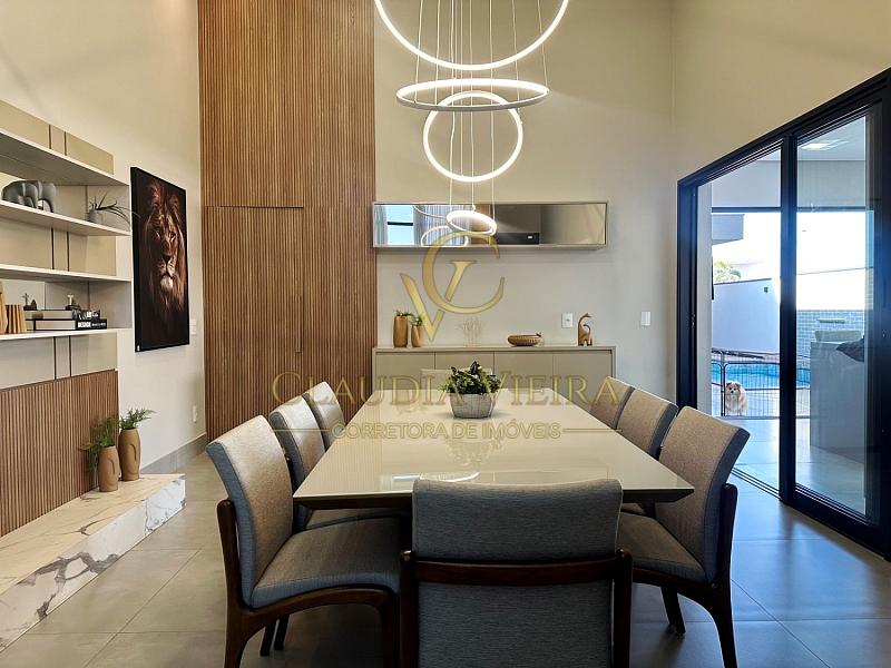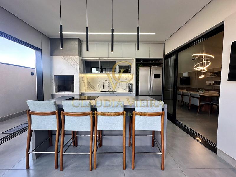 Fachada moderna, com detalhes em led e esquadrias pretas. Ao entrar, living de entrada, linda sala de TV, integrada com a sala de jantar e lavabo. Ambientes completos em marcenaria, com decoração moderna e imponente. A cozinha gourmet, em marmore branco, churrasqueira a carvão, completa em marcenaria e com eletrodomésticos. Ambientes fechados com esquadrias e vista para piscina.